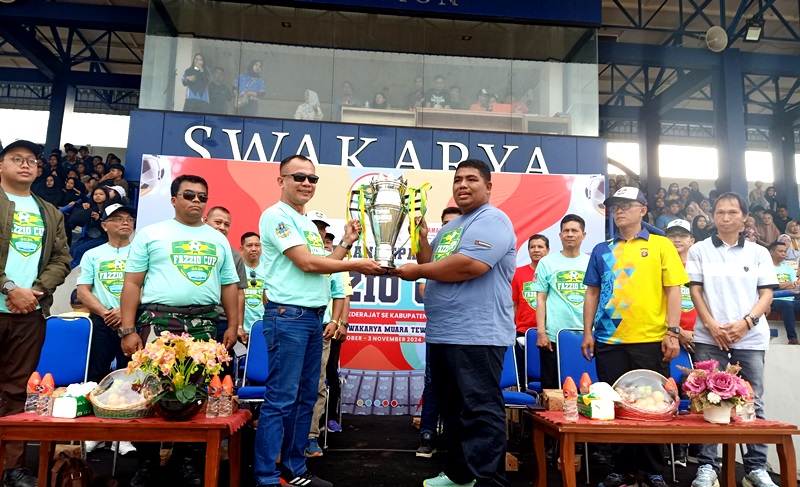 SERAHKAN PIALA BERGILIR-Staf Ahli Bupati Bidang Ekonomi dan Keuangan Heri Jhon Setiawan menyerahkan piala bergilir kepada ketua panitia kegiatan untuk diperebutkan kembali pada kejuaraan sepak bola Fazzio Cup 2024 di Stadion Swakarya Muara Teweh, kamis (17/10/2024).