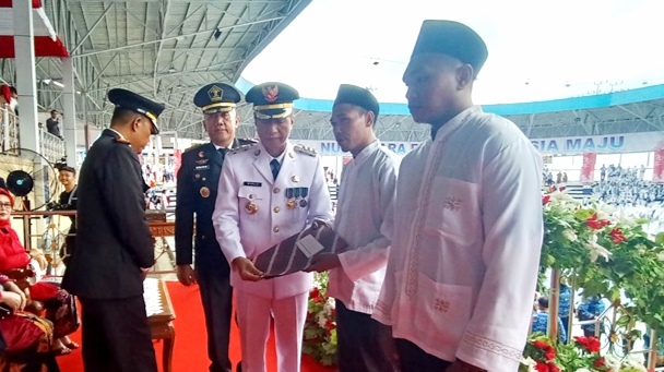 SERAHKAN REMISI UMUM-Pj Bupati Barito Utara Drs Muhlis didampingi Kepala Lembaga Pemasyarakatan Kelas II B Muara Teweh Huzaifah Makmur Hidayah menyerahkan remisi umum kepada dua perwakilan warga binaan Lapas Kelas II B Muara Teweh, usai peringatan HUT ke 79 RI di arena Tiara Batara Muara Teweh, Sabtu (17/8/2024).