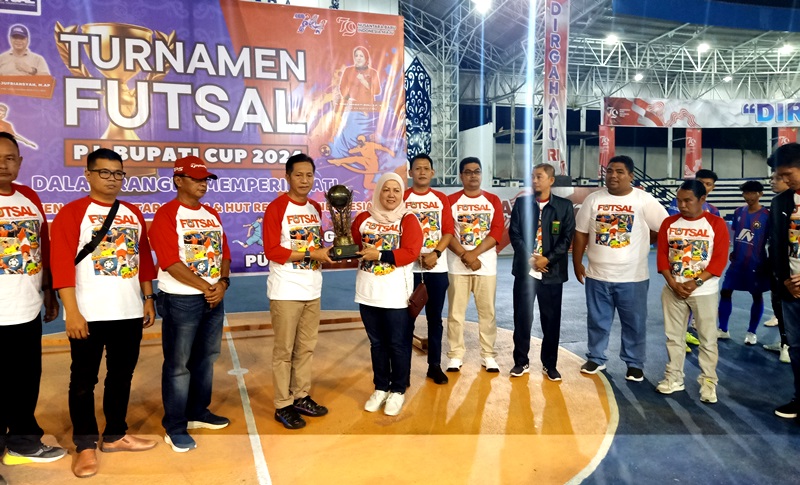 SERAHKAN PIALA BERGILIR-Pj Bupati barito Utara Drs Muhlis menyerahkan piala bergilir kepada Ketua AFK Barito Utara Henny Rosgiaty Rusli untuk diperebutkan kembali pada tournamen Futsal Pj Bupati Barito Utara Cup 2024, di arena Tiara Batara Muara Teweh, Selasa (20/8/2024) malam.