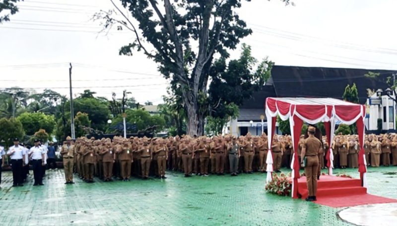 APEL GABUNGAN PEMKAB BARUT-Bupati Barito Utara H Shalahuddin saat pimpin apel gabungan di lingkup Pemkab setempat, Senin (20/54/2026) dihalaman kantor bupati.