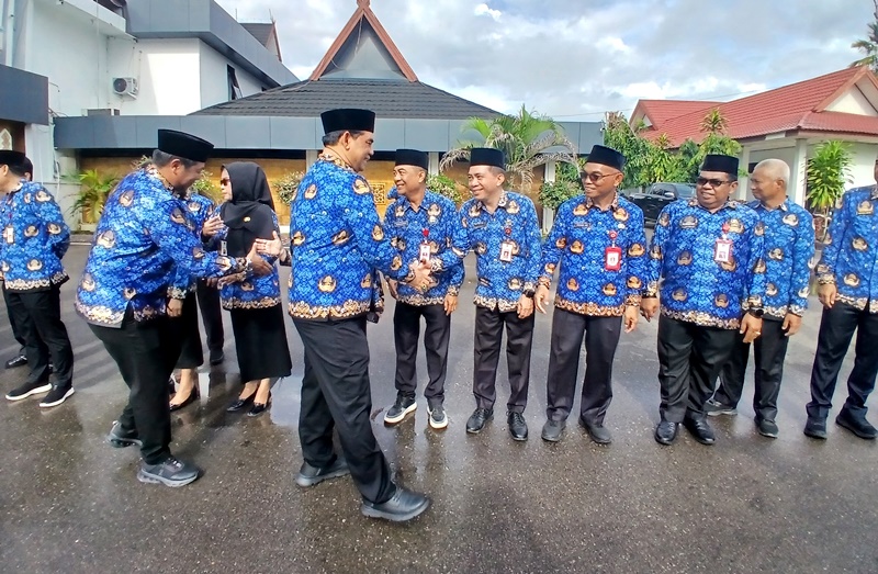 SALAMI KEPALA OPD-Usai pimpin apel gabungan lingkup Pemkab Barito Utara, Bupati H Shalahuddin didampingi Wakil Bupati Felix Sonadie Y Tingan dan Sekda Muhlis salami Kepala OPD lingkup Pemkab, Rabu (16/2/2026) di halaman kantor bupati.