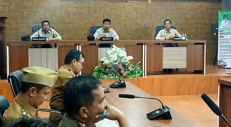 BUPATI PIMPIN RAKOR-Bupati H. Shalahuddin, didampingi Wabup Felix Sonadie Y. Tingan, dan Sekda Muhlis memimpin rapat koordinasi terkait kelangkaan Bahan Bakar Minyak (BBM) dan Gas Elpiji 3 Kg yang belakangan ini terjadi di wilayah Kabupaten Barito Utara. Rapat berlangsung di Aula Setda Lantai I, Selasa (13/1/2026).