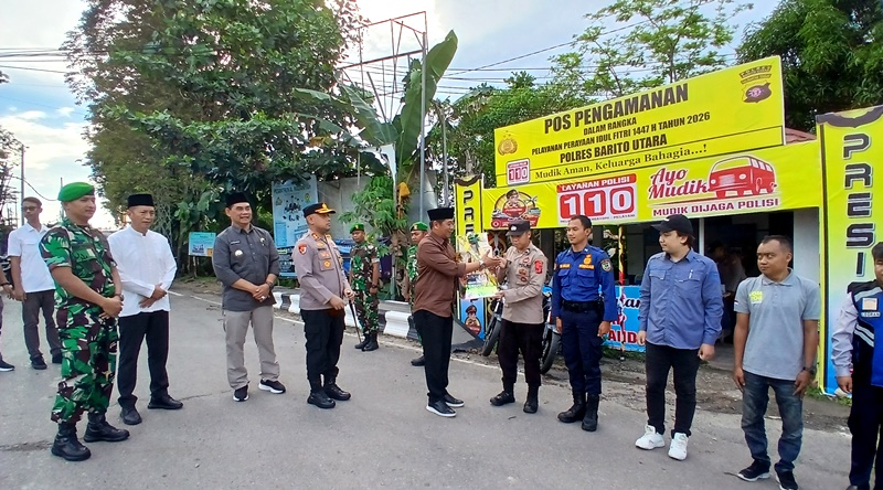 TINJAU POS PELAYANAN-Bupati Barito Utara, H Shalahuddin, didampingi Wakil Bupati Felix Sonadie Y Tingan dan jajaran unsur FKPD melakukan peninjauan ke sejumlah pos pengamanan dan pelayanan dalam rangka Operasi Ketupat Telabang 2026, Kamis (19/3/2026).
