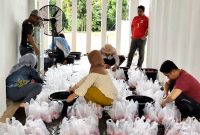 PEMOTONGAN HEWAN QURBAN-Para karyawan Dinas PUPR Kabupaten Barito Utara saat melakukan pemotongan dan pengemasan daging hewan qurban untuk dibagikan kepada warga dan para petugas…