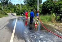 BERSIHKAN TUMPAHAN SOLAR-Tim Disdamkarmat Barito Utara membersihkan tumpahan BBM jenis solar di Jalan H Koyem (Simpang Wayang) Kelurahan Jingah Kecamatan Teweh Baru. TEWENEWS, Muara…