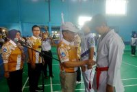 TANDA PESERTA O2SN-Kepala Dinas Pendidikan Barito Utara Syahmiluddin A Surapati didampingi Sekdis Pendidikan, Kabid Dikdas, dan pejabat lainnya mengalungkan tanda peserta kepada perwakilan peserta…