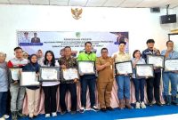 FOTO BERSAMA PENERIMA PENGHARGAAN-Kadis Nakertranskop UKM Barito Utara, M Mastur foto bersama perusahaan penerima penghargaan dari Pemkab Barito Utara melalui Dinas Nakertranskop UKM, Selasa…