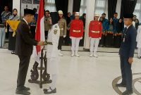 TERIMA DUPLIKAT BENDERA PUSAKA-Sekretaris Badan Kesatuan Bangsa dan Politik Kabupaten Barito Utara, Yudi E Rakhman menerima duplikat bendera pusaka yang diserahkan langsung oleh Kepala…