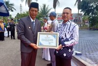 SERAHKAN PIAGAM PENGHARGAAN-Pj Bupati Barito Utara Drs Muhlis menyerahkan piagam penghargaan kepada Direktur Perusda Batara Membangun Asianoor Alihazeki usai peringatan Hari Pahlawan dihalaman kantor…