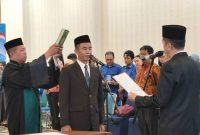 AMBIL SUMPAH DAN JANJI JABATAN-Pj Bupati Barito Utara Drs Muhlis ketika melantik dan mengambil sumpah dan janji jabatan Direktur PDAM Barito Utara Roosmanjaya Anor…