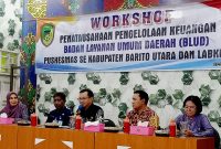 WORKSHOP PENATAUSAHAAN BLUD-Asisten Sekda Bidang Administrasi Umum H Yaser Arapat saat membuka kegiatan workshop Penatausahaan Pengelolaan Keuangan BLUD UPT Puskesmas dan Lapkesda di aula…