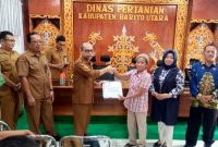ASN PURNA TUGAS-Kepala Dinas Pertanian Barito Utara H Adi Haryadi memberikan cinderamata kepada tiga ASN Dinas Pertanian yang memasuki purna tugas, di aula Dinas…