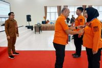 TANDA PESERTA PELATIHAN-Kepala Balai Pelatihan SDM Pencarian dan Pertolongan Badan Nasional Pencarian dan Pertolongan, Heru Suartanto didampingi Kalak BPBD Barito Utara Simamoraturahman kalungkan tanda…