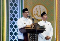 BUPATI DAN WAKIL BUPATI-Bupati H Shalahuddin selaku Ketua Panitia pelaksana didampingi Wakil Bupati Felix Sonadie Y Tingan saat menyampaikan laporan dalam penutupan MTQH ke…