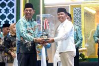 PIALA BERGILIR-Bubernur Kalteng H Agustiar Sabran menyerahkan piala bergilir kepaada Bupati Barito Utara H Shalahuddin untuk diperebutkan kembali pada MTQH ke XXXIII tingkat Kalteng…