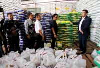 TINJAU STOK BAHAN PANGAN-Wakil Bupati Barito Utara Felix Sonadie Y Tingan didampingi Asisten Sekda Eveready Noor, Kepala Dinas Sosial PMD Suparmi A Aspian, Kepala…