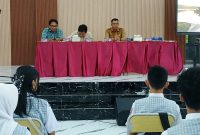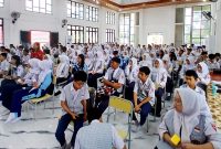 PESERTA SOSIALISASI UKBI-Siswa dan siswi kelas IX saat mengikuti kegiatan sosialisasi dan Simulasi Uji Kemahiran Berbahasa Indonesia (UKBI) Adaptive di Aula SMPN 1 Muara…