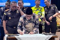 PENANDATANGANAN PKS-Pj Bupati Indra Gunawan bersama Gubernur Kalteng dan pihak Kejaksaan melaksanakan penandatanganan Perjanjian Kerja Sama (PKS) Program Jaksa Garda Desa dan Koperasi Merah…