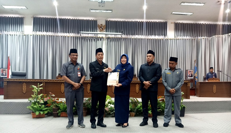 SERAHKAN PIDATO PENGANTAR-Pj Bupati Barito Utara Drs Muhlis didampingi Pj Sekda Jufriansyah menyerahkan pidato pengantar KUA PPAS TA 2025 kepada Ketua DPRD Hj Mery Rukaini didampingi Wakil Ketua I dan II DPRD, di gedung DPRD setempat, Senin (15/7/2024).