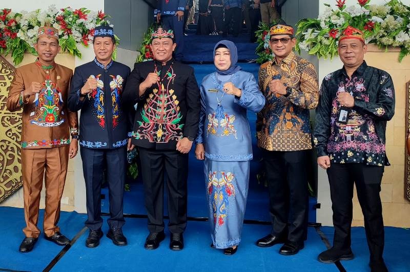 BERSAMA WAGUB KALTENG-Pj Bupati Barito Utara Drs Muhlis didampingi Ketua DPRD Barito Utara Hj Mery Rukaini, Wakil Ketua II DPRD Provinsi Kalteng H Jimmy Carter dan Kepala BPJS Muara Teweh dan pejabat lainnya foto bersama Wakil Gubernur Kalteng H Edy Pratowo usai peringatan Hari Jadi ke 74 Kabupaten Barito Utara, di arena Tiara Batara Muara Teweh, Senin (22/7/2024).