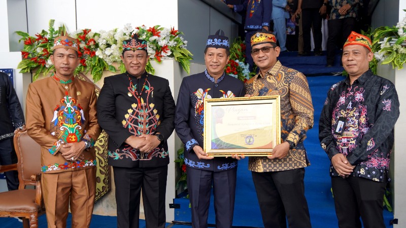 TERIMA PIAGAM PENGHARGAAN UHC-Pj Bupati Barito Utara Drs Menerima piagam penghargaan UHC yang diserahkan oleh Deputi Direksi Wilayah VIII BPJS Kesehatan, Nuim Mubaraq didampingi Kepala BPJS Kesehatan Cabang Muara Teweh, Achmad Zainuddin, Wakil Gubernur Kalteng H Edy Pratowo dan Wakil Ketua II DPRD Kalteng H Jimmy Carter usai peringatan Hari Jadi ke 74 Kabupaten Barito Utara, di arena Tiara Batara Muara Teweh, Senin (22/7/2024).