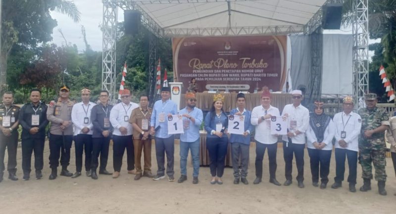 Komisi Pemilihan Umum (KPU) Kabupaten Barito Timur secara resmi menetapkan tiga Bakal Pasangan Calon (Bapaslon) usai dilakukan pengundian, menjadi Pasangan Calon (Paslon) Bupati dan Wakil Bupati sebagai peserta Pilkada yang akan digelar tanggal 27 November 2024.