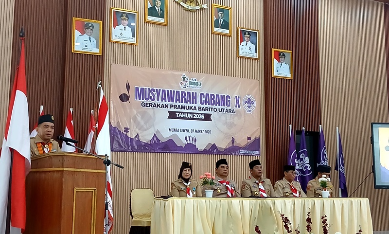 TEWENEWS, Muara Teweh – Musyawarah Cabang (Muscab) Kwartir Cabang (Kwarcab) Gerakan Pramuka Kabupaten Barito Utara ke-10 resmi digelar di aula SMPN 1 Muara Teweh, Sabtu (7/3/2026). Kegiatan tersebut dihadiri Bupati dan Wakil Bupati Barito Utara, Sekda, mewakili Ketua Kwarda Kalteng serta jajaran pengurus Kwartir Cabang dan anggota Pramuka se-Kabupaten Barito Utara.