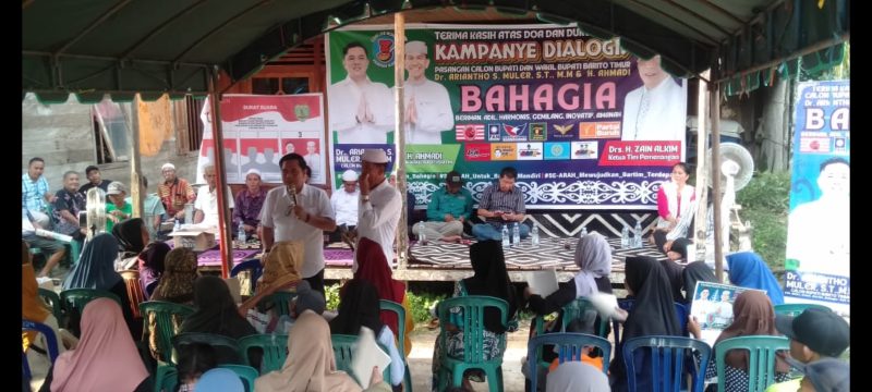 TEWENEWS, Barito Timur- Memasuki hari ketiga, Pasangan calon (Paslon) Nomor 3 Calon Bupati dan Wakil Bupati Barito Timur, Dr Ariantho S Muler ST MM – H Ahmadi (ARAH), kembali menyapa warga di sampaikan visi misi di 3 desa yang terletak di Kecamatan Dusun Tengah dan Kecamatan Pematang Karau, dalam kampanye Dialogis, Sabtu (12/10/2024).