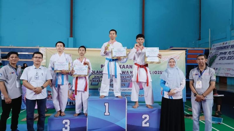 JUARA O2SN TINGKAT KABUPATEN-Ketua Panitia pelaksana O2SN tingkat Kabupaten Barito Utara, Samsul Astorijaya foto bersama juara O2SN cabang karate usai menyerahkan medali dan penghargaan, di GOR Panglima Batur Muara Teweh, Minggu (9/6/2024).