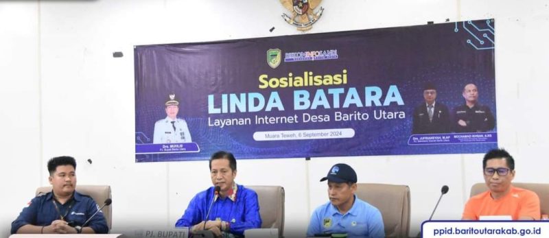 Sosialisasi LINDA BATARA dipimpin langsung oleh Pj. Bupati Barito Utara, Drs. Muhlis didampingi Kadis Kominfo Sandi, Moch Ikhsan, Kepala Bidang E-Goverment Diskominfosandi, Munawar Khalil, dan dihadiri oleh Direktur Comerce PT Comtelindo, Fajar Aulia Rahmatullah serta 43 kepala desa yang terdaftar sebagai desa berstatus blankspot.