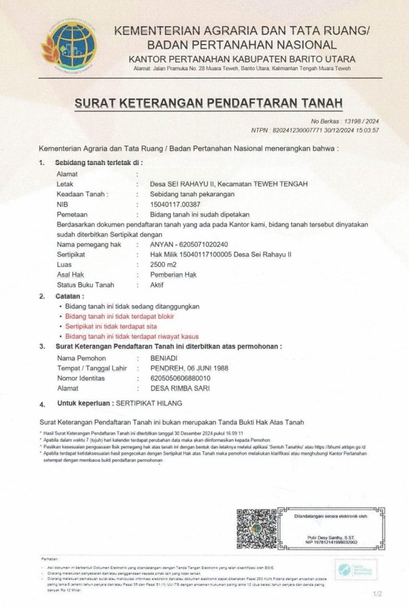 Telah melakukan pengajuan permohonan penerbitan Sertifikat baru Atas Nama Beniadi (Ahli Waris) pada tanggal 30 Desember 2024, nomor berkas 13198/2024, NTPN : 820241230007771 30/12/2024 15:03:57