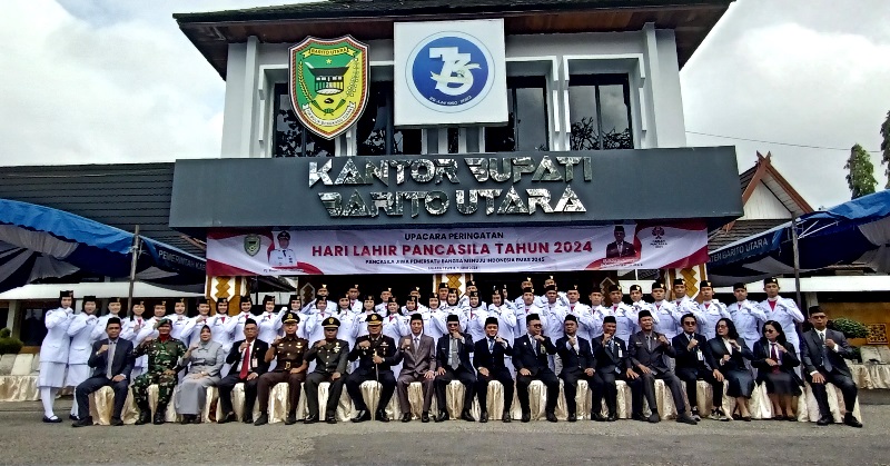 PERINGATAN HARI LAHIR PANCASILA-Pemerintah Kabupaten Barito Utara peringari Hari Lahir Pancasila dengan melaksanakan upacara bendera di halaman kanto bupati, Sabtu (1/6/2024).