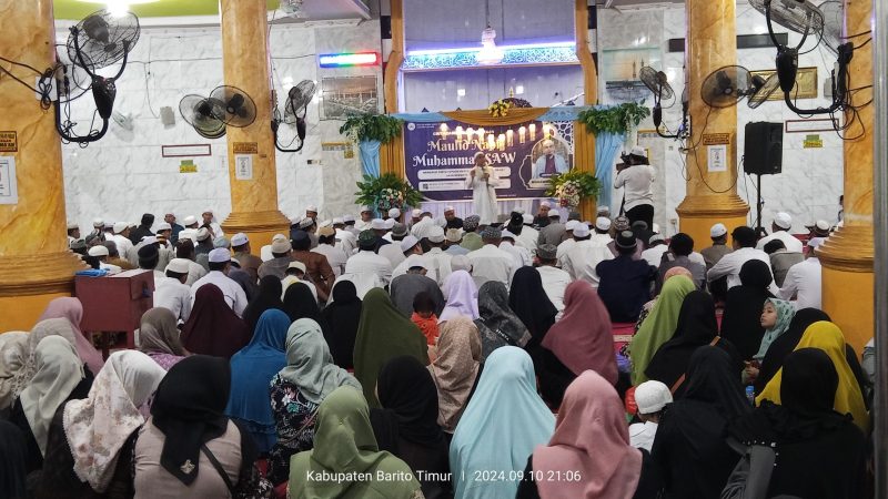 TEWENEWS, Tamiang Layang – Dalam rangka Memperingati hari lahir Nabi Muhammad SAW di bulan Rabiul Awal 1446 Hijriah, Pengurs Masjid Darul Ibadah Tamiang Layang Kecamatan Dusun Timur Kabupaten Barito Timur menggelar perayaan maulid Nabi dan di sambut antusiasme umat muslim Tamiang Layang dan sekitarnya, Selasa malam 10 Sepetember 2024.