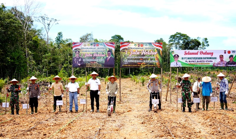 TANAM JAGUNG DILAHAN PT MPG-Pj Bupati Barito Utara, Drs Muhlis bersama Kapolres, AKBP Singgih Febianto, mewakili Dandim 1013 Mtw, pimpinan PT MPG dan para petani melaksanakan tanam jagung dilahan PT MPG, Kamis (13/3/2025)