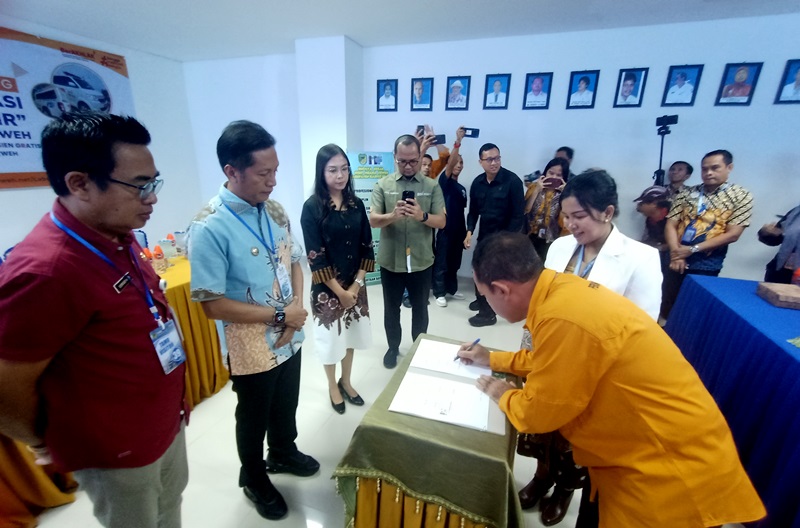 TEKEN KERJASAMA-Pj Bupati Barito Utara Drs Muhlis didampingi Asisten Sekda Bidang Pemerintahan dan Kesra, Eveready Noor dan pejabat lainnya menyaksikan saksikan penandatanganan (teken) kerjasama antara RSUD dan Perusda Batara Membangun, Jumat (4/10/2024).