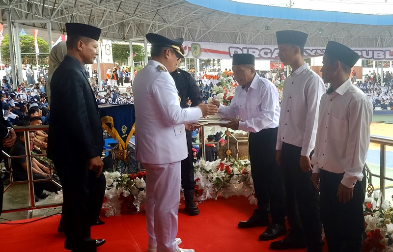 SERAHKAN REMISI UMUM-Pj Bupati Barito Utara Indra Gunawan didampingi Kepala Lembaga Pemasyarakatan Kelas II B Muara Teweh Halason Sinaga menyerahkan remisi umum kepada tiga perwakilan warga binaan Lapas Kelas II B Muara Teweh, usai peringatan HUT ke 80 RI di arena Tiara Batara Muara Teweh, Minggu (17/8/2025)