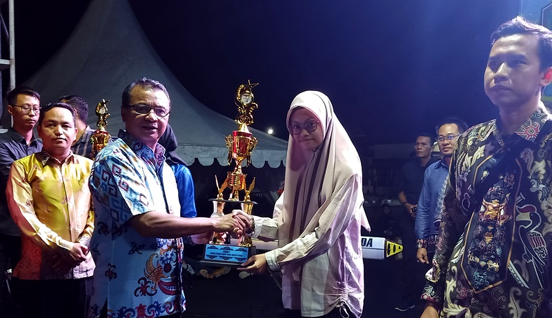 SERAHKAN PIALA DAN PIAGAM-Pj Sekda Barito Utara Drs Jufriansyah menyerahkan piala dan uang pembinaan kepada juara I lomba Desain Batik Khas Barito Utara pada penutupan Batara Expo tahun 2024, di eks Bandara Beringin Muara Teweh, Senin (4/8/2024) malam.