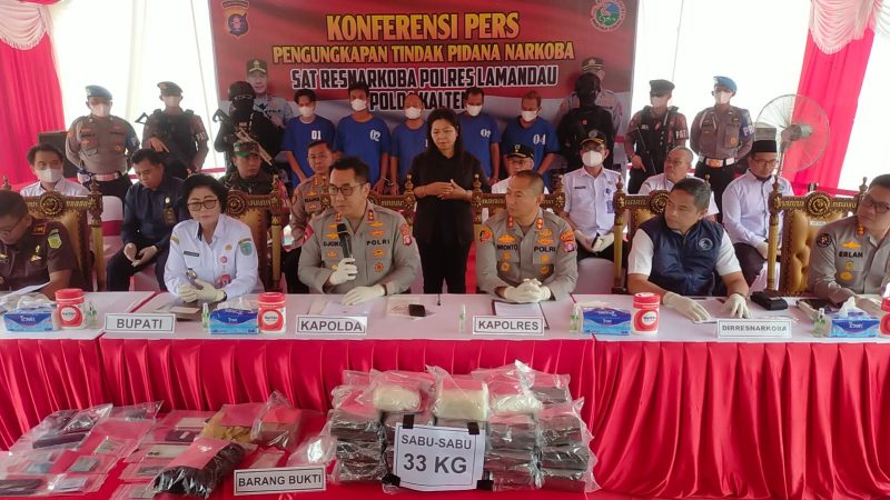 “Selain barang bukti Sabu seberat 33,838 kilogram, pihak kepolisian juga menyita barang bukti berupa uang tunai, henpon, kendaraan bermotor dan kartu ATM yang digunakan para tersangka. Pengungkapan ini menunjukkan peredaran narkoba bukan hanya di kabupaten Lamandau saja, namun merupakan lintas provinsi,”ucap Kapolda.