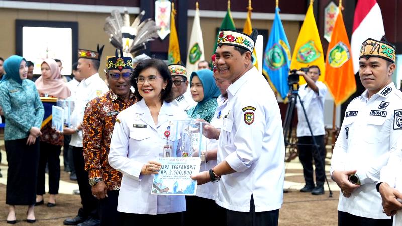 TERIMA PENGHARGAAN-Bupati Barito Utara H Shalahuddin bersama Ketua TP PKK Barito Utara menerima penghargaan meliputi Juara Terfavorit Penilaian Kinerja Stunting Tahun 2025, Juara 2 Pekan Genting Tahun 2025, serta Juara 5 Peta Jalan Pembangunan Kependudukan (PJPK) Berkualitas Tahun 2025, di aula Rabu (29/04/2026), di Aula Jayang Tingang, Kantor Gubernur Kalimantan Tengah.
