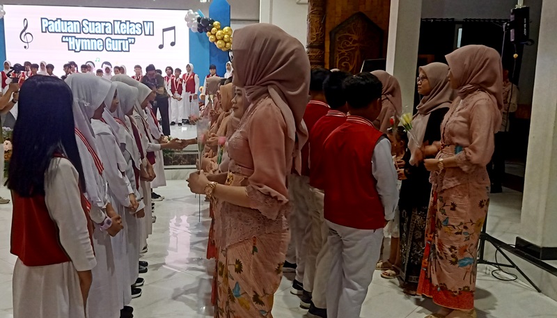 SERAHKAN BUNGA-Siswa siswi SDN 5 Melayu kelas VI yang melaksnakan perpisahan dan pelepasan menyerahkan bunga kepada bapak dan ibu guru SDN 5 Melayu, bunga yang diserahkan sebagai ucapan terima kasih para siswa siswi kepada tenaga pendidik, di gedung balai Antang Muara Teweh, Sabtu (1/6/2024).