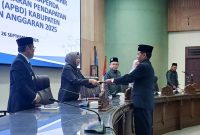 KESEPAKATAN BERSAMA-Pj Bupati Indra Gunawan bersama unsur pimpinan DPRD Barito Utara penandatanganan kesepakatan bersama Rancangan Peraturan Daerah tentang APBD Perubahan tahun 2025, di ruang…