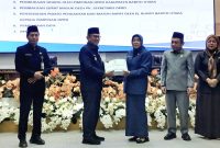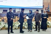 SERAHKAN PIDATO PENGANTAR DAN MATERI RAPAT-Pj Bupati Indra Gunawan didampingi Sekda Muhlis menyerahkan pidato pengantar dan materi rapat Raperda tentang Pertanggungjawaban Pelaksanaan Anggaran Pendapatan…