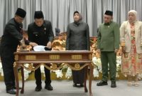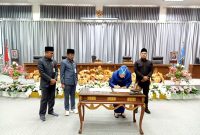 PERSETUJUAN BERSAMA-Pj Bupati Barito Utara Drs Muhlis didampingi Pj Sekda Jufriansyah menandatangani persetujuan bersama dengan unsur pimpinan DPRD pada rapat paripurna DPRD di gedung…