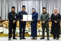 SERAHKAN PANDANGAN UMUM FRAKSI-Ketua DPRD Barito Utara Hj Mery Rukaini didampingi Wakil Ketua I dan Wakil Ketua II DPRD menyerahkan pemandangan umum fraksi kepada…
