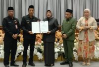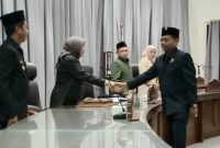 TANDATANGANI BERITA ACARA PENETAPAN-Ketua Sementara DPRD Hj Mery Rukaini dan Wakil Ketua Sementara DPRD H Parmana Setiawan tandatangani berita acara Rancangan Keputusan DPRD dan…