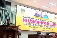 SAMPAIKAN SAMBUTAN PJ BUPATI-Asisten Sekda Bidang Administrasi Umum, H Yaser Arapat menyampaikan sambutan Pj Bupati Bariot Utara Indra Gunawan pada pembukaan Musorkablub KONI Barito…