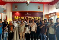 BERSAMA KETUA KPU-Usai melaksanakan press conference, Ketua KPU Barito Utara Siska Dewi Lestari bersama anggota foto bersama dengan awak media, di ruang RPP KPU…