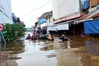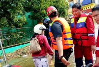 BANTU EVAKUASI WARGA-Personel piket tim reaksi cepat (TCR) Pusdalops-PB BPBD Kabupaten Barito Utara saat melakukan evakuasi warga terdampak banjir, Sabtu (19/4/2025) di jalan Perwira…