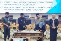 SERAHKAN LKPJ TAHUN 2024-Pj Sekda Jufriansyah didampingi Asisten bidang Pemerintahan Eveready Noor menyerahkan LKPj tahun anggaran 2024 kepada Ketua DPRD Hj Mery Rukaini didampingi…