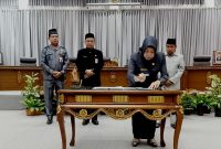 PENANDATANGANAN KOMITMEN BERSAMA-Kepala Daerah yang diwakili Asisten Sekda dan Pimpinan DPRD melaksanakan penandatnganan fakta integritas usai rapat paripurna DPRD, Senin (12/8/2024). TEWENEWS, Muara Teweh…